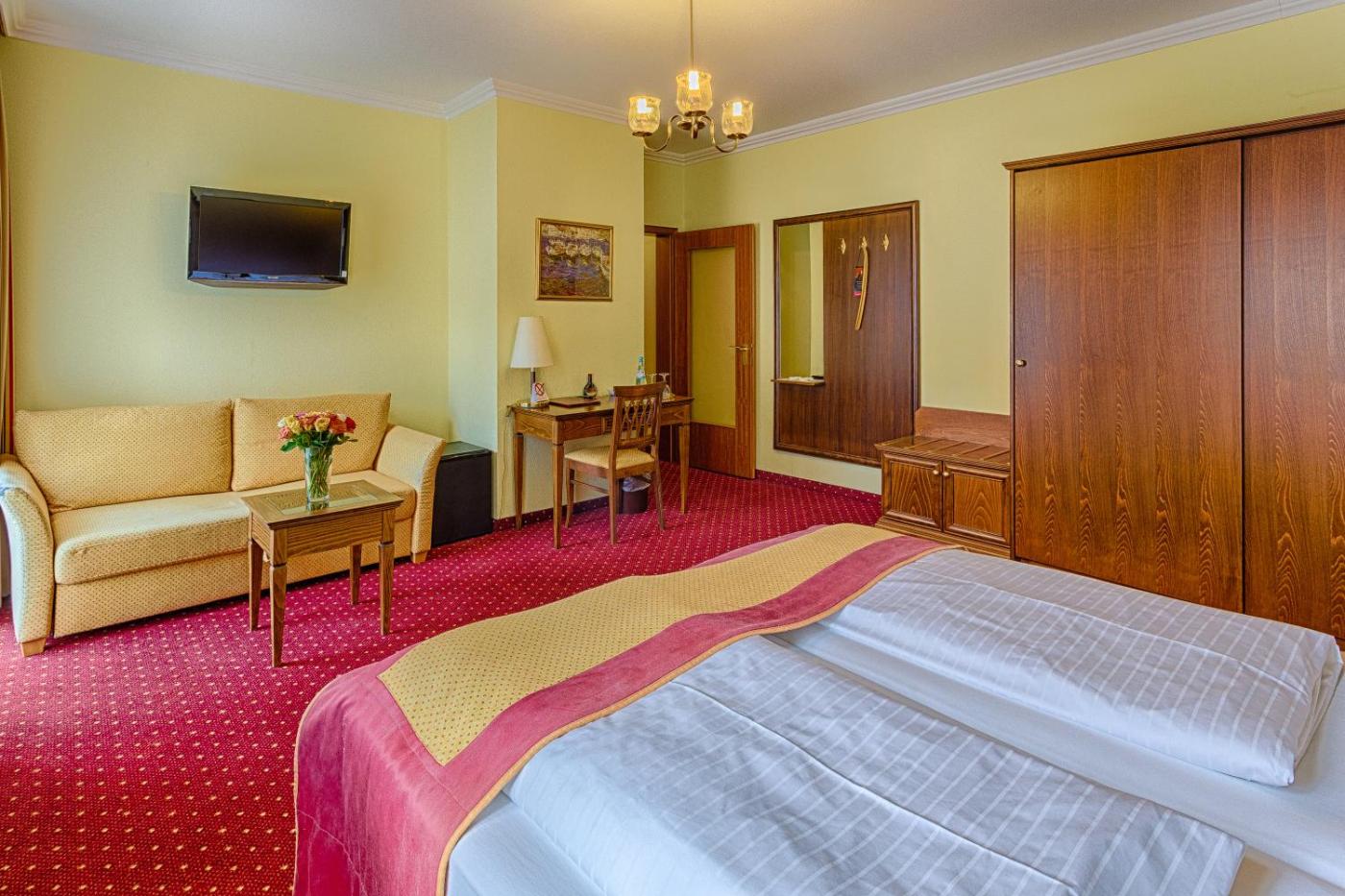 Doppelzimmer. Dieses klassisch eingerichtete Zimmer verfügt über einen Flachbild-TV und einen Arbeitstisch. Im eigenen Bad liegt ein Haartrockner für Sie bereit. Die meisten dieser Zimmer liegen zur ruhigen Seitenstraße hin. ;