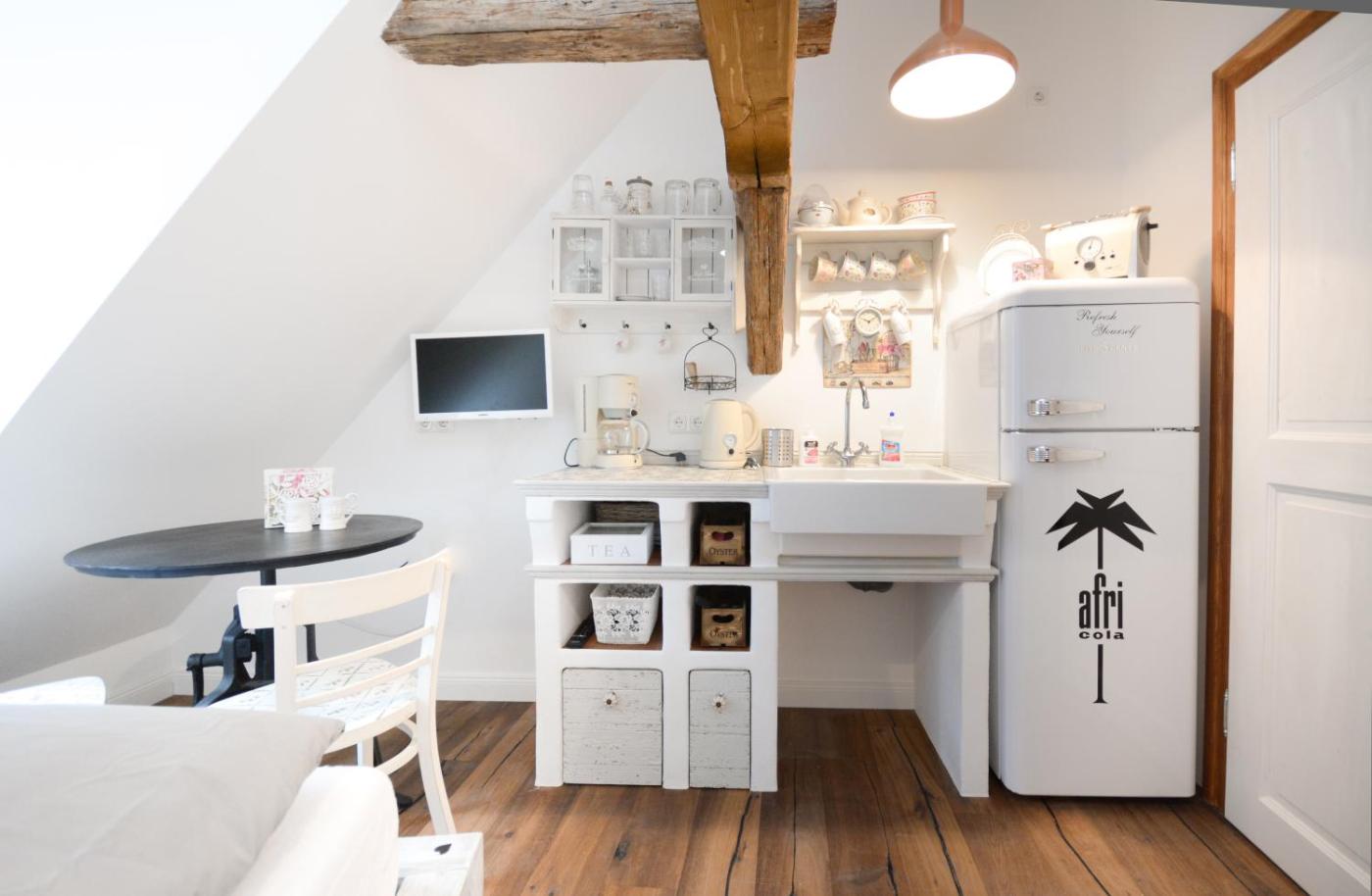 Die Küche verfügt über einen Toaster und einen Kühlschrank. Ein Flachbild-Kabel-TV ist ebenfalls vorhanden.