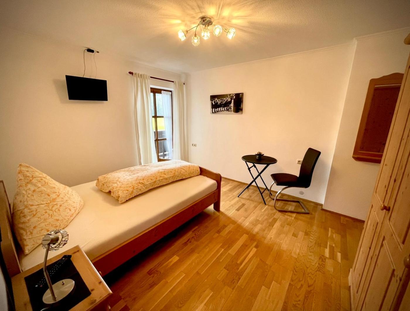 Einzelzimmer mit Balkon. The single room features a wardrobe, parquet floors, heating as well as a balcony with mountain views. The unit offers 1 bed.