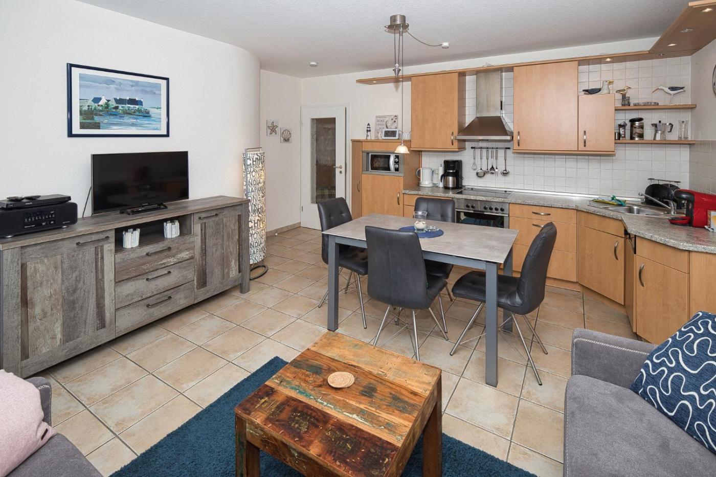 Die Unterkunft Residenz Trossenstek, FeWo 2 ist ausgestattet mit 2 Schlafzimmern, einer Küchenzeile mit einem Kühlschrank und einem Geschirrspüler, einer Waschmaschine und 1 Badezimmer mit einem Haartrockner. Es gibt einen TV und einen DVD-Player.