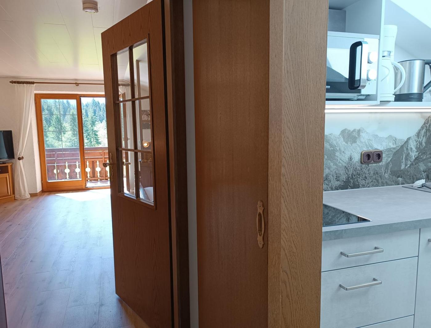 Apartment mit Blick auf die Berge. This apartment features 1 bedroom, a kitchenette and 1 bathroom with a shower. Guests can make meals in the kitchenette that has a stovetop, a refrigerator, kitchenware and a toaster. Boasting a balcony with mountain views, this apartment also features a coffee machine and a flat-screen TV. The unit has 1 bed. ;