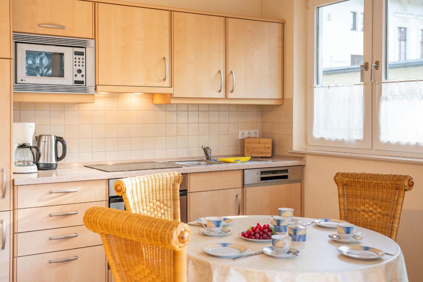 Apartment mit Balkon. This spacious apartment comprises 1 living room, 1 separate bedroom and 1 bathroom with a shower and a hairdryer. The well-equipped kitchen features a stovetop, a refrigerator, a dishwasher and kitchenware. Featuring a balcony, this apartment also provides a coffee machine, a seating area and a TV with cable channels. The unit offers 2 beds.