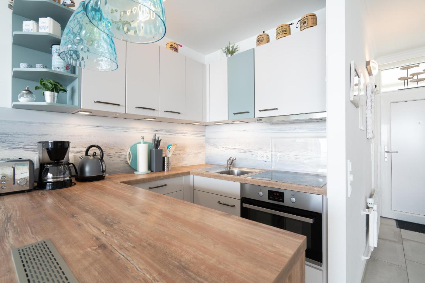 Apartment mit Meerblick. This apartment features a kitchen, a seating area, 1 separate bedroom and 1 bathroom with a shower and a hairdryer. Guests can make meals in the kitchen that has a stovetop, a refrigerator, a dishwasher and kitchenware. Boasting a balcony with sea views, this apartment also features a washing machine and a TV. The unit has 1 bed.